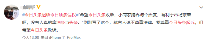 目前尚不清楚,拼多多、快手是否有把今日油条诉至法律。对于被今日头条起诉一事,油条老板回应亮了..."只是觉得“傍大牌”好玩。"