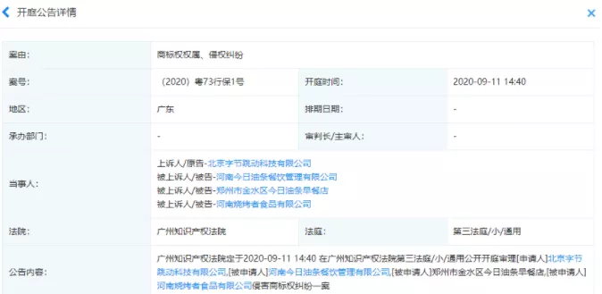 据启信宝显示,目前,该案于9月11日在广州知识产权法院公开开庭审理。北京字节跳动科技有限公司对此申请行为保全(案由为商标权权属、侵权纠纷),被告方为河南今日油条餐饮管理有限公司、郑州市金水区今日油条早餐店、河南烧烤者食品有限公司。据悉,“今日油条”背后的公司河南今日油条餐饮管理有限公司成立于2020年05月13日,注册资本100万元,不仅短短几个月就开始了招商做运营店,在今年7月份的时候还与正大集团签署战略伙伴关系协议,就是那个家喻户晓的节目正大综艺背后的大佬。河南烧烤者食品有限公司成立于2017年10月16日,注册资本100万元。该公司有一条网站备案记录为www.jryoutiao.com,网站名称为今日油条。打开该网站可见关于今日油条的介绍:河南烧烤者餐饮管理有限公司历经8年市场积淀,已成为集烧烤饮食文化研究、烧烤食材及设备研发供应、烧烤行业策划咨询、烧烤技术培训、烧烤品牌运营及运营服务等综合战略业务于一体品牌化餐饮连锁集团,公司现运营有:“梁山烤肉”、“水浒烤肉”、“京城铁帽子王”、“烧烤客”、“今日油条”等五大餐饮连锁品牌。郑州市金水区今日油条早餐店为个体工商户,核准日期为2020年6月16日,经营者为赵亚东。更厉害的是,河南今日油条餐饮管理有限公司成立第二天就申请了“今日油条”的商标,分别申请注册在第43类-餐饮住宿、第30类-方便食品和第35类-广告销售,申请注册了今日豆花、今日面条、今日豆浆、饼多多、快手抓饼、明日油条等商标,部分申请流程处于等待实质审查状态。