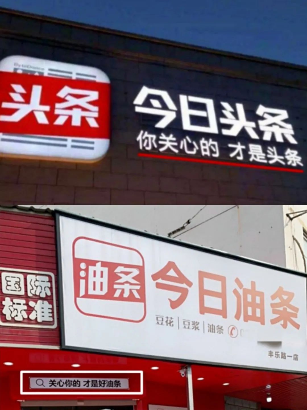 “今日头条”是我们大众所熟知的名字,它于2012年创建,专门为用户推荐信息、提供连接人与信息的服务的产品。但在2020年位于河南的一家年轻早餐名牌餐饮管理有限公司挂出了“今日油条”的名字,河南的“今日油条”公司,不但拥有与“今日头条”相似的名字,还设计了与今日头条LOGO及其app界面高度相似的店面,并且还有与今日头条“你关心的才是好头条”相似的标语:“关心你的才是好油条”。因此,“今日头条”公司以“今日油条”公司的店铺装修、LOGO、海报和“今日头条”极其相似,处处都有“今日头条”的影子,抄袭了其极具有独创行标志的设计为由将“今日油条”告上了法庭。“今日油条”与“今日头条”风马牛不相及却如出一辙。